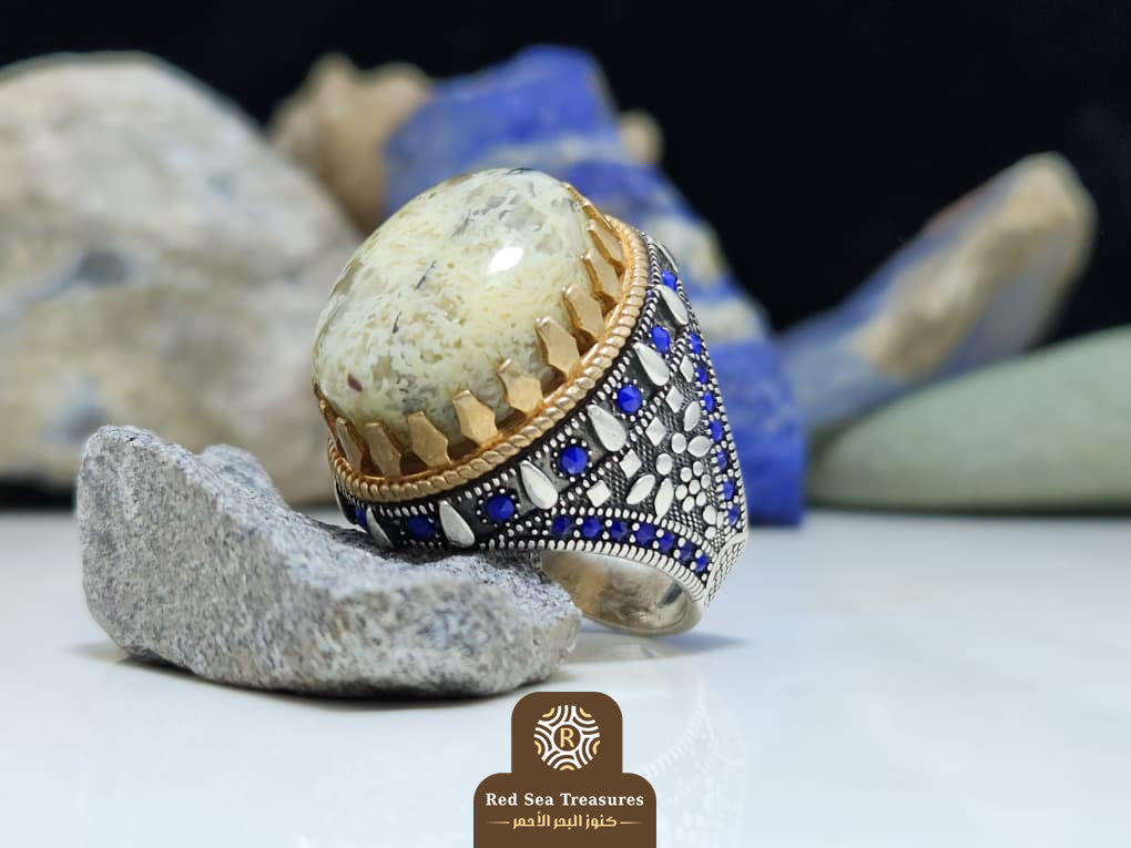Handcrafted sterling silver ring set with a natural cream agate stone, accented with blue enamel details and a gold-tone crown...