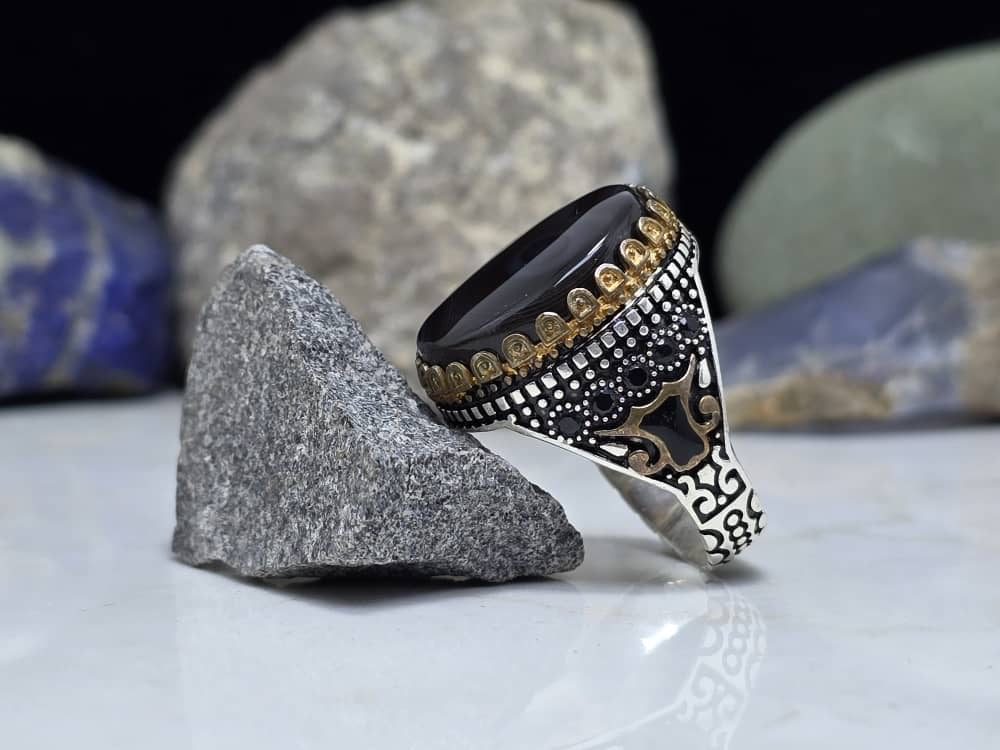 Handcrafted sterling silver ring set with a deep black natural stone, featuring intricate engraved patterns and gold-tone detailing inspired by...