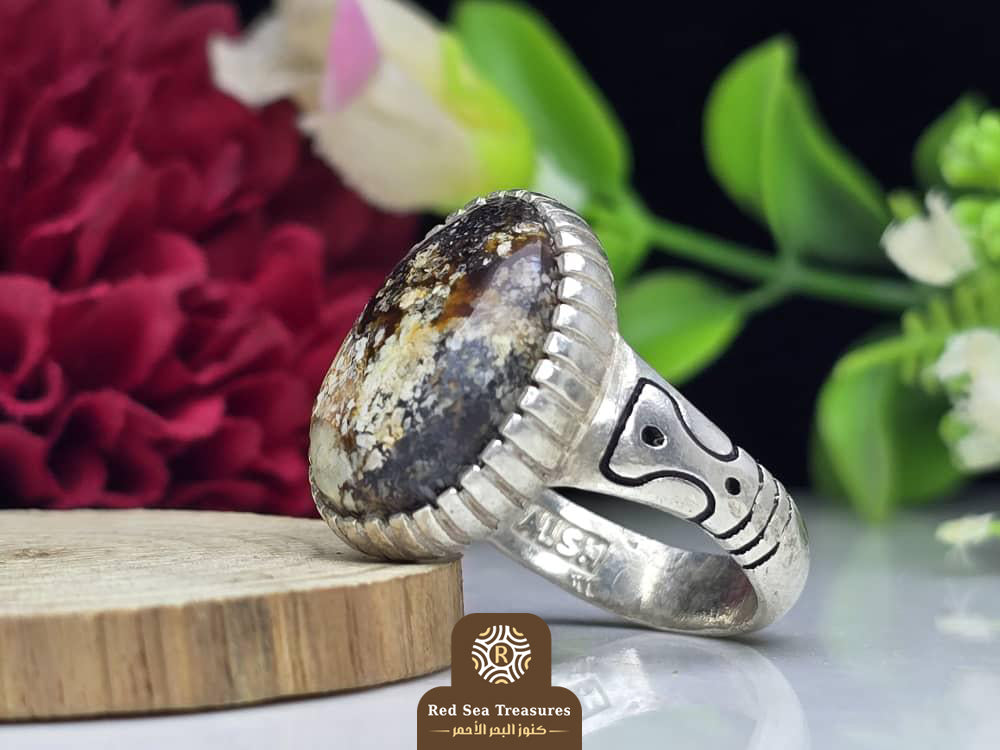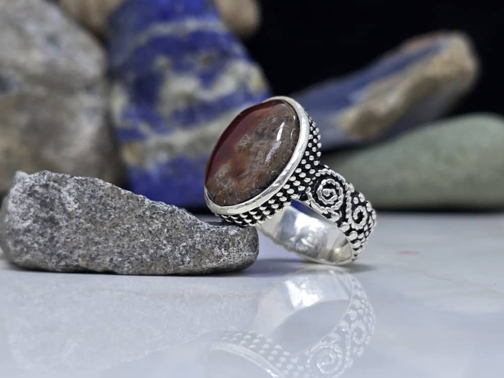 Handcrafted sterling silver ring featuring a natural agate stone, finished with intricate traditional detailing.