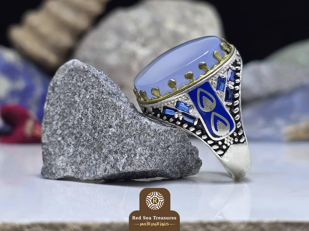 Handcrafted sterling silver ring set with a smooth blue agate stone, accented with a gold crown setting and rich blue enamel side detailing inspired by traditional design.