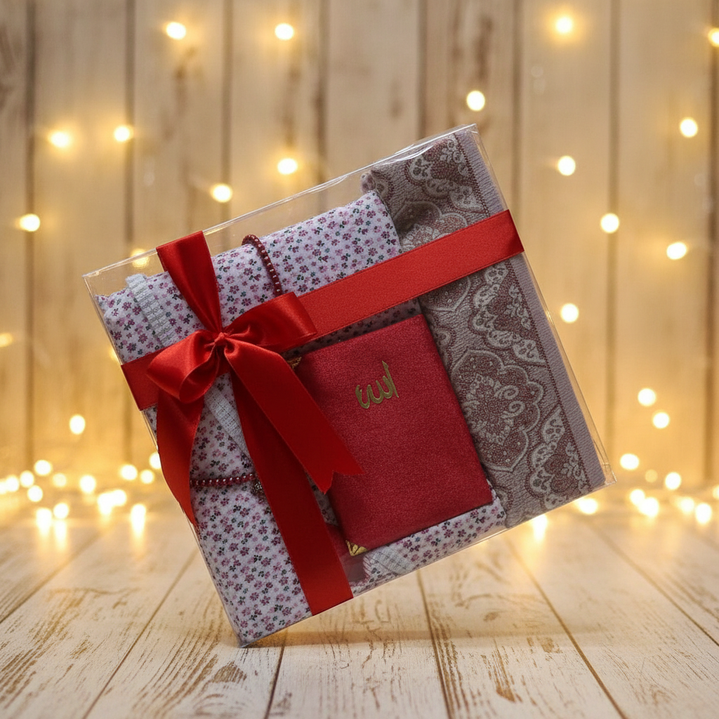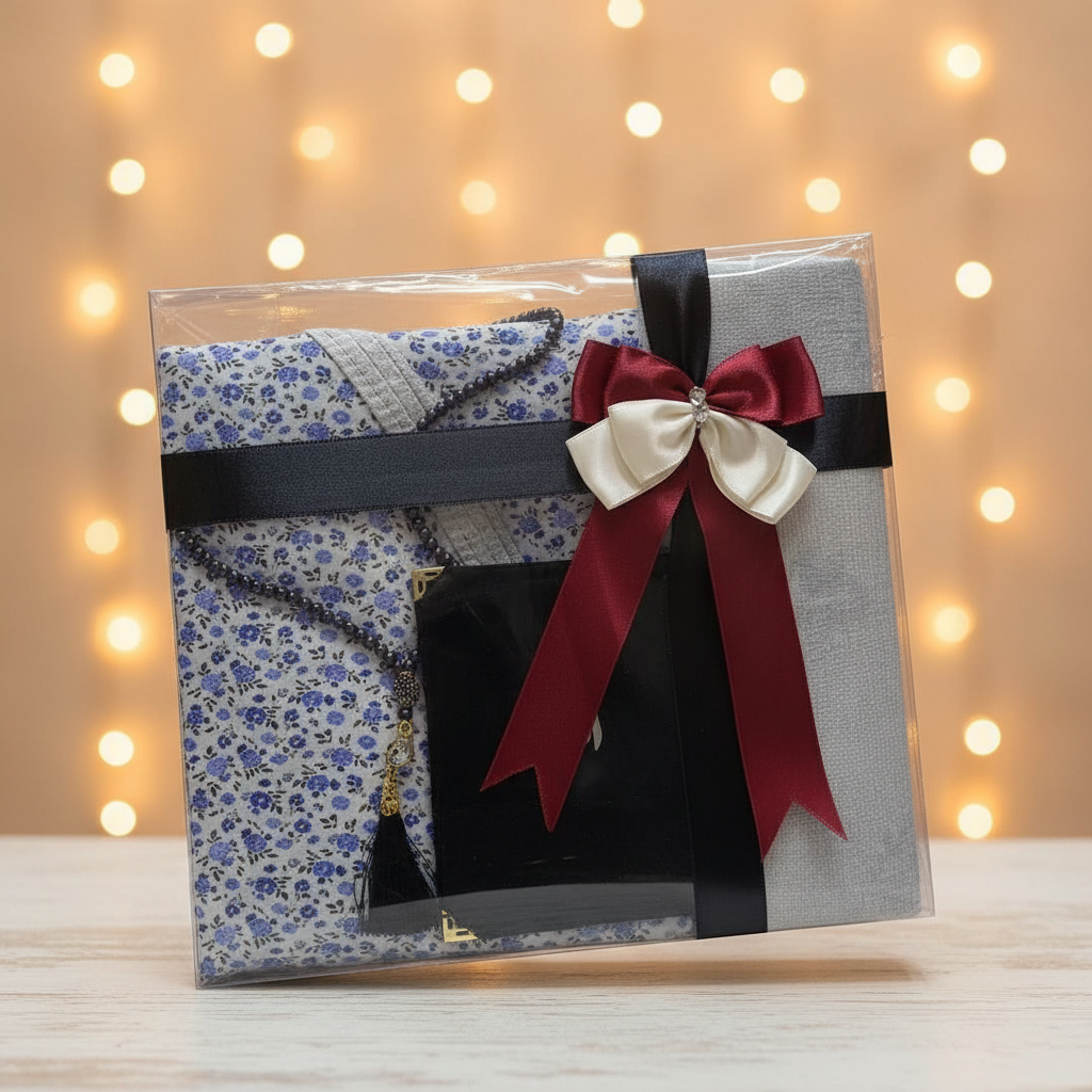 This elegant Gift Prayer Set includes a prayer salat dress (free size, made of soft cotton), a matching prayer mat, and a Juz Yaseen.