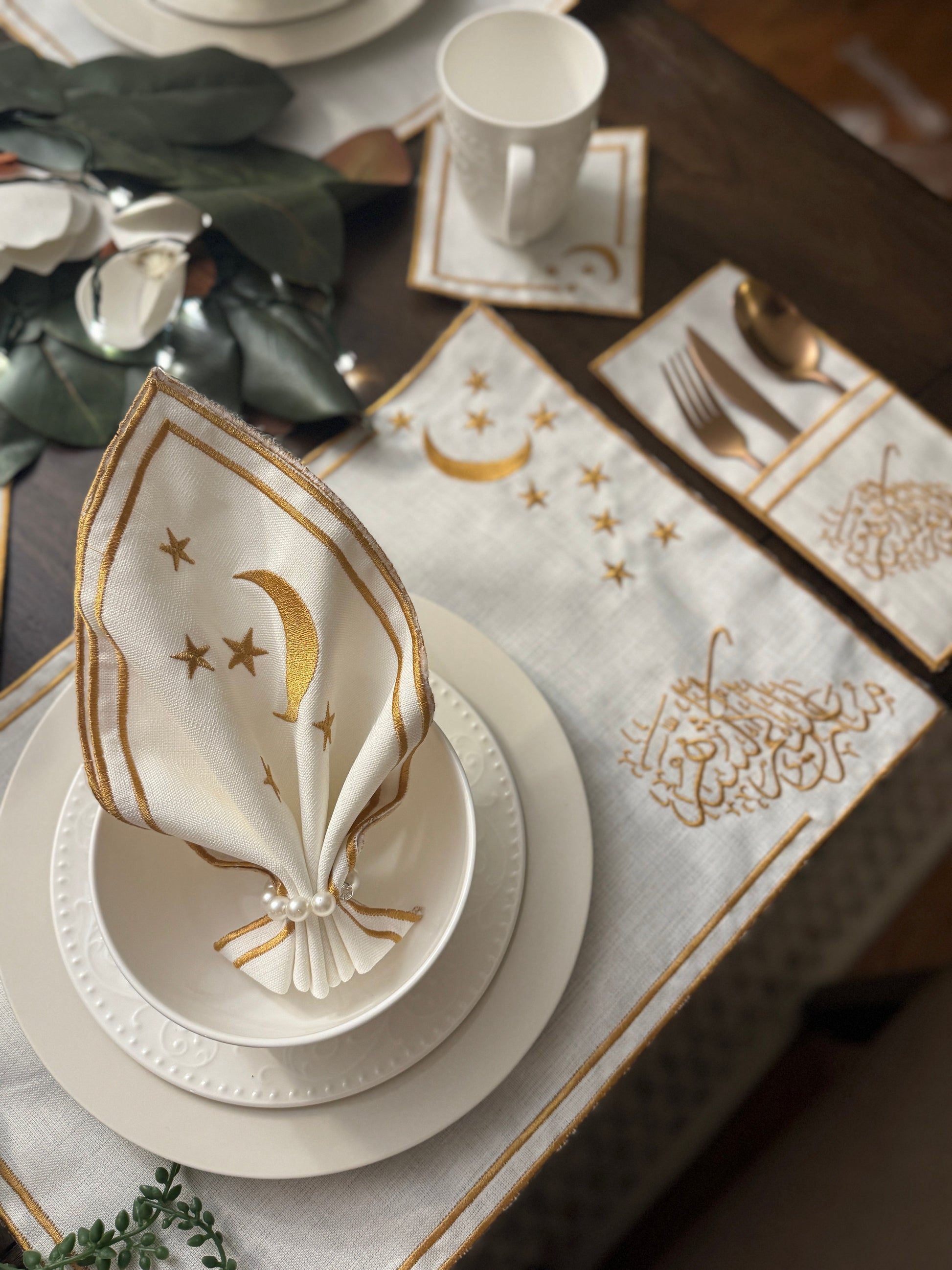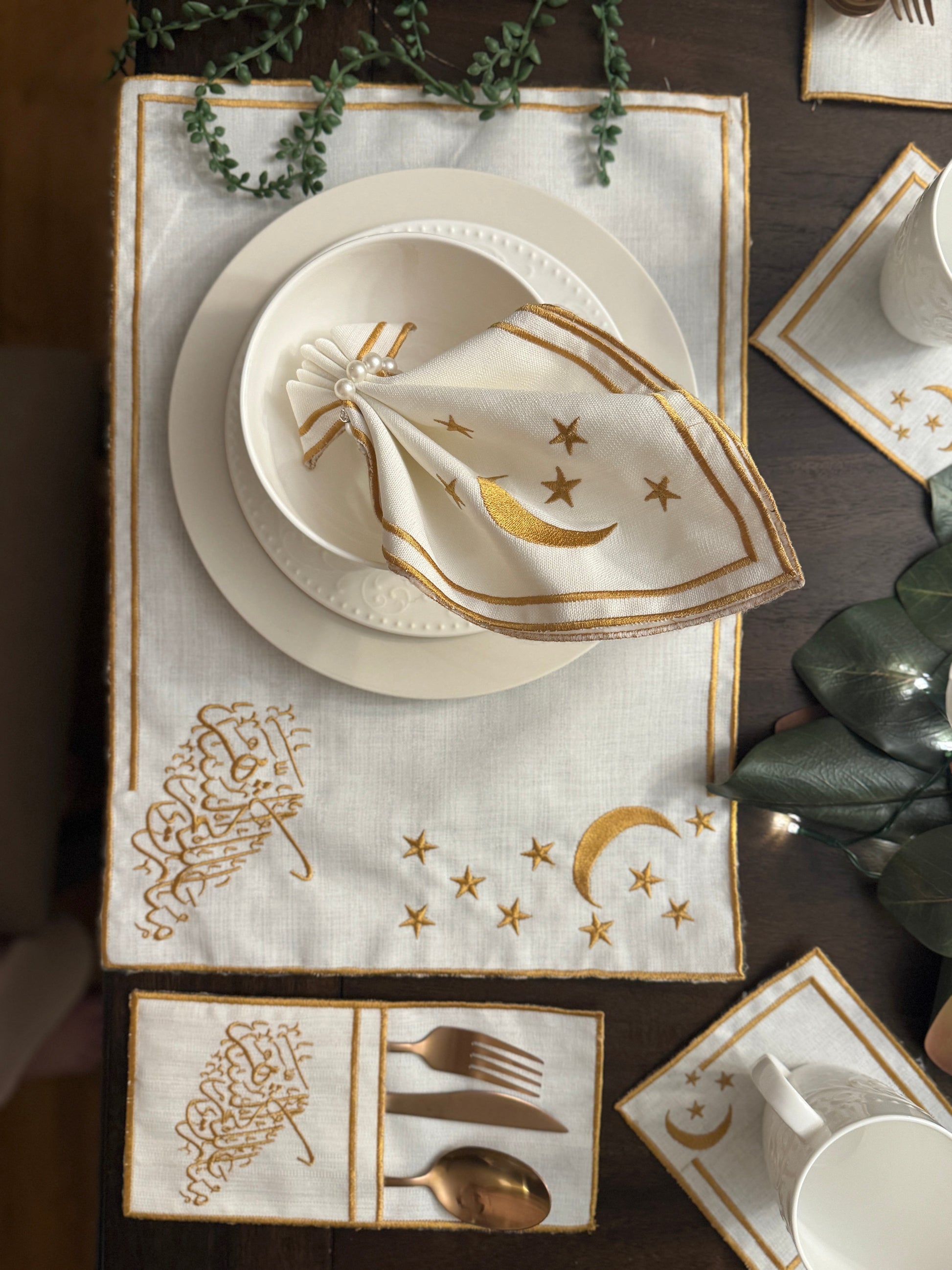 Each item is exquisitely embroidered with golden silk thread, adding a luxurious finish to your Ramadan table setting.